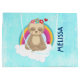 Un joli dessin animé d'une paresse méditante. Portant une couronne de fleurs sauvages sur la tête, flottant paisiblement sur un nuage blanc avec un arc-en-ciel coloré derrière. Quelques coeurs à proximité. Paisible et heureuse. L'arrière - plan est une image de style gris bleu clair.