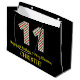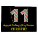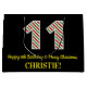 Ce sac cadeau de Noël simple et amusant et sur le thème de l'anniversaire du 25 décembre est doté d'un grand numéro "11", avec un motif à rayures rouge, blanc et vert. Il comporte également le message "Joyeux 11e anniversaire & Joyeux Noël", et un nom personnalisé. L'arrière - plan est noir de couleur. Un sac cadeau comme celui-ci pourrait être utilisé pour envelopper des cadeaux qui sont donnés à quelqu'un qui est né le 25 décembre (jour de Noël) et qui célèbre son onzième anniversaire. [~Z0000407]