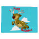 Joyeux Noël - Feliz Navidad Flying Reindeer sac cadeau personnalisé avec son joli petit renne souriant et texte en anglais et en espagnol : Joyeux Noël et Feliz Navidad, le tout sur un arrière - plan bleu vif. Personnalisez tout ou partie de ce sac cadeau : images, texte, couleur arrière - plan.