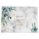 Impression en pierre de marbre comme arrière - plan. Décoré avec de la verdure d'eucalyptus aquarellée, et du feuillage doré. Personnalisez et ajoutez une date et le nom de la mariée et du marié. Texte gris et doré. Parfait pour l'emballage cadeau ou pour les faveurs.