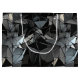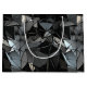 Les superpositions de panneaux 3D créent une image interdimensionnelle, en noir et blanc.