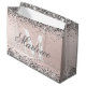 Elégante Parties scintillant d'argent et sac cadeau de monogramme rose avec un nom de script de calligraphie personnalisable et un modèle monogramme gras.