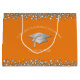 This modern design features a graduation hat and confetti in silver on a background of Orange with white text.