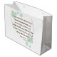 Ce jour de Saint Patrick, offrez à d'autres la belle vérité que les richesses de l'amour du Christ ne sont que de la chance ! Ce grand sac cadeau inspirant la foi présente une couronne d'épines en forme de coeur nichée sur un arrière - plan de shamrocks irlandais. Il dit : "Pas de chance, juste d'amour." ainsi que le passage biblique adresse Romains 8:31-39 qui nous rappelle la promesse de Dieu que ceux qui sont dans le Christ ne peuvent jamais être séparés de son amour. Le dos affiche un segment du passage Romans 8 encadré par plus de shamrocks. Une belle façon de répandre la Bonne Nouvelle qu'il n'est pas nécessaire pour les croyants de chercher un pot d'or quand Sa présence permanente est la meilleure chance possible de la vie et au-delà!