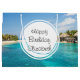 Joyeux sac cadeau d'anniversaire avec une belle photo avec une station balnéaire tropicale. Jolie plage de sable blanc et d'eau bleue avec des paillotes, ce qui lui donne une ambiance insulaire tranquille. Un cercle blanc superposé avec votre texte à l'intérieur.