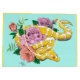 Un Python albino jaune se déplace autour de roses roses et pêche dans un arrière-plan turquoise.