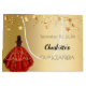Un arrière - plan à l'allure fausse or décoré d'étoiles et d'une fille portant une tiare et une robe rouge. Personnalisez et ajoutez nom, date.