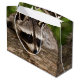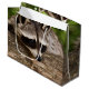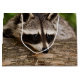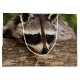 Un sac cadeau avec la photo d'un joli et curieux raton laveur reposant son visage sur une rondelle de bois. Adorable.