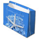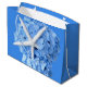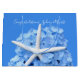 Jardin de bord de mer, sac cadeau en papier à thème de plage fleurie en grande taille. Ajoutez un message personnalisé avec des noms, en écriture blanche, et utilisez ce joli sac cadeau fleuri pour tenir des cadeaux de mariage ou de douche. Ne laissez pas votre texte s'approcher des bords. L'image bleue de l'hydrangée et de l'étoile de mer est de part et d'autre d'une jolie couleur bleu vif.