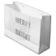 Élégant et amusant, ce sac cadeau est le moyen parfait pour offrir un cadeau pour Noël, Hanoukka, Anniversaire ou toute autre occasion spéciale. Présente des étoiles d'argent, de la neige et le texte "Joyeux et lumineux" sur un arrière - plan blanc.