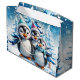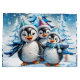 Trois adorables pingouins se dressent dans des casquettes d'hiver festifs et des écharpes colorées. Leurs grands yeux ronds brillent de joie, tandis que leurs ventres blancs moelleux contrastent avec le sapin bleu vif décoré de lumières scintillantes. Les pingouins sourient joyeusement et semblent prêts à célébrer la magie de la saison des fêtes. Tout autour, des flocons de neige délicats dansent dans l'air, tandis que des étoiles scintillantes brillent dans le ciel, créant une atmosphère chaleureuse et festive. Ce design reflète parfaitement l'esprit de Noël - plein de joie, d'amitié et d'émerveillement hivernal !