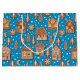 Motif vectoriel tiré à la main avec diverses maisons en pain d'épice, sapins, flocons de neige et biscuits en forme de croissant sur le bleu avec chute de neige