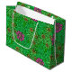 Grand sac cadeau dans un vintage William Morris, Art Nouveau, imprimé damassé marigold feuilles et fleurs, numériquement rehaussé et coloré, en émeraude profonde et vert citron, accentué de rose fuchsia et orange de corail, sur un arrière - plan vert foncé