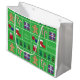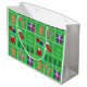 Un grand sac de cadeau construit avec un motif avec quelques symboles de Noël sur des rectangles verts. Vous pouvez éditer et mettre vos propres mots. Joyeux Noël !