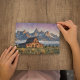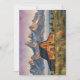 This postcard features a watercolor style portrait of the John Moulton Barn in front of the Teton mountain range in Grand Teton National Park.