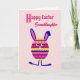 A cute Easter bunny in the shape of an Easter egg, decorated with spots, stripes and zigzags in pink, blue and yellow. The message inside can be customised, or you can use the suggested "A happy Easter bunny is here to wish a special granddaughter a very Happy Easter!"