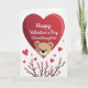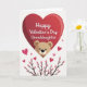 This greeting card shows a large red heart near the top, shaded to look softly rounded. Across the heart, the text reads “Happy Valentine’s Day Granddaughter” in white, flowing cursive-style lettering. A cute teddy bear peeks out from behind the heart, showing its head and paws with round ears, wide dark eyes, and a small black nose. The bear’s sweet expression makes the card feel gentle and caring, like a hug in picture form 🥰. The background is white, with smaller pink hearts floating upward beneath the main heart. There are also thin branches with tiny pink buds mixed in, adding a soft, springlike touch. It feels meaningful because it pairs a simple love message with an affectionate character that suits a granddaughter ❤️. Wishing you a happy time sharing Valentine’s Day sentiments.