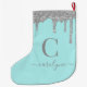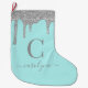 Vacances Turquoise Aqua et Silver Éperche Parties scintillant Drips Monogramme Noël Stocking avec fêtes en argent faux parties scintillant dégoulinant luxuriamment sur le côté d'un chic bas bleu turquoise. Ajoutez votre nom et votre monogramme pour un stockage de Noël vraiment glamour. Le luxe est au rendez-vous, vos vacances aussi ! Parfait pour votre esthétique de luxe. Contactez-nous à cedarandstring@gmail.com si vous avez besoin d'aide pour la conception ou la mise en correspondance des produits.