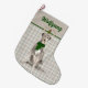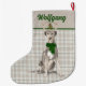Un bas de Noël festif a une aquarelle illustrant un joli Wolfhound irlandais portant des bois de jour et une écharpe d'hiver sur un plaid neutre, avec le nom de votre chiot des deux côtés.