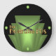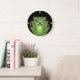 Horloge murale en acrylique noire ronde de 10,75 po avec l'image d'un élément décoratif Art Déco vert brillant sur le noir et "The Roaring 20s" en lettrage doré. Les orbes vertes brillantes marquent les positions 12, 3 et 9. Voir l'ensemble de la collection Roaring 20s Clock dans le DECOR | Section Horloges.
