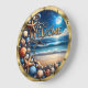 Cette horloge murale circulaire présente une scène de plage illuminée par le clair de lune. Le premier plan est orné d'un riche assortiment de coquillages irisés, de perles et d'étoiles de mer. Le mot "BIENVENUE" est élaboré à partir d'un script doré et perlé. Derrière, des vagues lunes tapissent doucement le rivage sous un ciel étoilé, le tout encastré dans un cadre doré et côtelé.