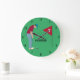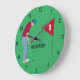 Green personalised golfer, wearing a cap, deep red shirt and blue pants, putting a golf design clock. Customise the text.
