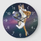 Grande Horloge Ronde Chat avec une planète et manger une pizza