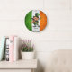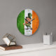 On a background that bears the colors of the Irish flag, elegantly, leaning on a cane and smiling, with mischief in his eyes, Irish Leprechaun. He wears the traditionnelle irish leprechaun clothing. His beard - no mustache - and strands of hair are orange and his ears pointy. His country of origin, Ireland, is underneath him. The hour numbers of this clock design are transparente, with a darker glow around them. For our Irish friends, or all those who love Ireland ! P.S. Look for our other matching designs...!