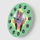 Long haired calico cat viewing it's mirrored image, standing in front of a diamond shape in pastel rainbow colors. Cat is mostly white with browns, et black patterned pour. Clock "numbers" are black paw prints with 4 toes.