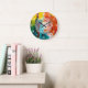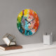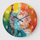 A white petal mandala is overlaid on a bold yellow, orange, et turquoise blue abstract painting. Add style and color to any room with this colorful clock.