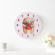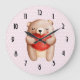 A clock with a cute watercolor illustration A brown teddy bear carrying a big red heart. Pink polka dot background.