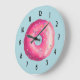 A delicious looking clock with a yummy illustration of a pink frosted donut with colorful sprinkles. Set on retro blue colored background.