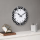 Cette horloge murale présente un élégant motif damassé floral blanc sur un arrière - plan noir.