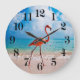 This round shape wall clock is shown with a photo print of a beautiful flamingo beachside.