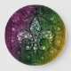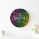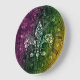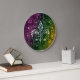 This Mardi Gras themed clock has a fleur de lis made of skulls against a grungy green yellow and purple background.