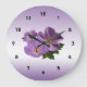 This lovely wall clock is decorated with magenta purple Cranesbill Geranium flowers, each with a lovely golden yellow center, and green foliage. They are set on a pale lilac gradient background.