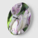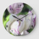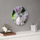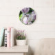 C'est une photo de belles fleurs lilas et blanches, imprimée sur une horloge murale avec des numéros chic et nolisés.