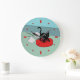This cute clock has a cartoon of a kitten riding a robot vacuum.