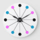 A retro wall clock with an Atomic Age Retro 1950 s theme, with black spokes and circles in teal, pink and black, no numbers. For your vintage themed room, menacé ou spaceship.