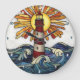 Cette horloge ronde présente une illustration stylisée d'un phare rayé rouge et blanc au milieu des vagues tourbillonnantes bleues et blanches. Un grand soleil éclatant de jaune et d'oranges chaudes rayonne derrière le phare. Le visage de l'horloge a des chiffres clairs et des mains noires. L'ensemble est audacieux et graphique, évoquant un sentiment d'aventure maritime et de beaux jours au bord de la mer.
