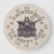 Cette horloge express le sentiment éffrayant "une maison hantée est une maison heureuse" dans un motif à fausse croix.