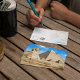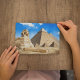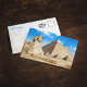 Cette carte postale présente un portrait aquarelle des grandes pyramides de Gizeh en Egypte.