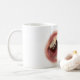 Une grande bouche ouverte et dents sur l'avant de cette tasse de café.