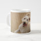 Goldendoodle, bouche ouverte, oreilles clignotantes, court à travers l'herbe haute.