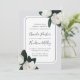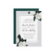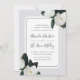 Elegant and graceful floral wedding invitation features chic white magnolia flowers and dark green leaves at the corners, framing your wedding details in hand lettered script, block and italic typefaces on a grey and white background. Invitations reverse to rich green.