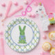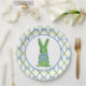 This topiary plate design features a very chic blue and green lattice patterned background with a coordinating bunny shaped topiary with a coordinating blue bow.