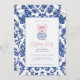 This Christmas party invitation has a preppy grandmillennial design featuring a Christmas ornament with a blue and white Chinoiserie design with a pink bow. The front and back have a coordinating damask pattern.