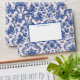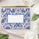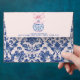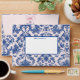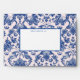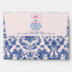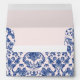 This envelope features a preppy grandmillennial design featuring a navy blue damask pattern on a blush pink background. There is a place on the flap to add your name and address below a blue and white Chinoiserie ornament with a pink bow. The front and back have a coordinating damask pattern and the inside is blush pink.