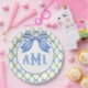 This topiary plate design features a very chic blue and green lattice patterned background with a coordinating blue and white striped bow. You can personalize with your monogram.