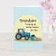 This card features a stylized blue farm vehicle parked on a rich green patch of ground, its large wheels and raised cabin drawn with simple shapes and smooth color fills. From the front scoop, a stream of small oval eggs pours out in sunny yellow, orange, purple, and watery blue, like a shared surprise spilling into the scene 🐰. The gentle tumble of eggs feels like a friendly gesture, as if the driver is happily gathering treats for someone special. A soft yellow arc sits near the top like a warm halo, setting a cozy backdrop for the message. Across that arc, the text reads “Grandson Scooping up Easter Wishes for You,” placed above the vehicle in a flowing, cursive-style font. The letters appear in a darker tone that stands out clearly against the yellow, while the rest of the background stays a calm light blue 🌷. The scoop is angled forward, and the eggs scatter in a curved trail from the bucket down toward the grass.